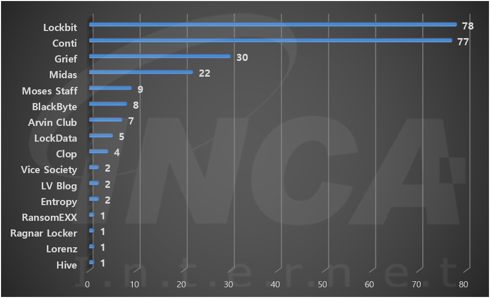 2021년 11월(11월 1일 ~ 11월 30일)에 발생한 데이터 유출 현황을 랜섬웨어 진단명 별로 비교하였을 때 "LockBit" 랜섬웨어가 78건으로 가장 많은 데이터 유출이 있었고, "Conti" 랜섬웨어가 77건으로 두번째로 많이 발생했다.