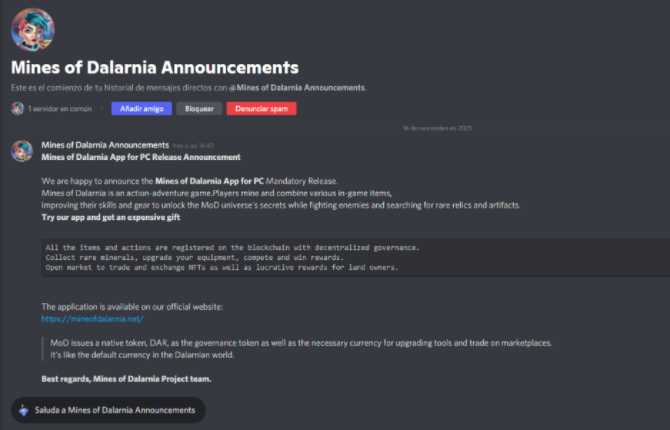 "Babadeda" 크립터를 사용해 난독화한 악성코드가 디스코드에서 배포된 정황이 발견됐다. 해당 악성코드는 NFT 또는 암호 화폐와 관련된 디스코드 채널에서 배포 중이며, "Mines of Dalarna" 게임 등의 블록체인과 관련된 게임으로 위장한 것으로 알려졌다. 사용자가 디스코드에서 수신한 메시지 내의 URL을 클릭하면 피싱 사이트로 연결해 악성 파일을 다운로드하며 실행을 유도한다. 보안 전문가들은 "Babadeda" 크립터로 인해 생성된 악성코드는 탐지 및 대응이 어려우므로 주의할 것을 권고했다.