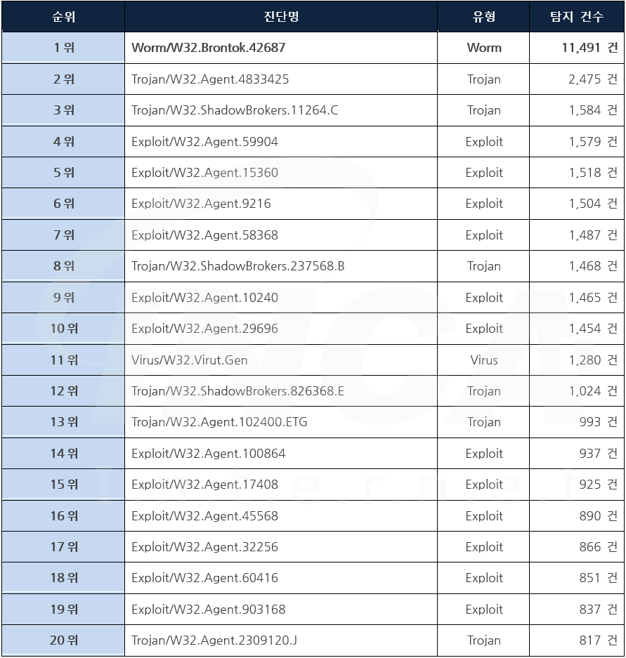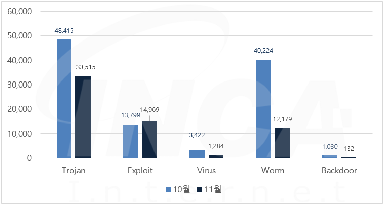 11월에는 악성코드 유형별로 10월과 비교하였을 때 Exploit의 진단 수가 증가하고, Trojan, Virus, Worm 및 Backdoor 의 진단 수가 감소했다.
