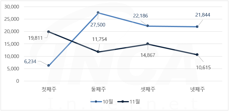 11월 한달 동안 악성코드 진단 현황을 주 단위로 살펴보았을 때 10월에 비해 감소한 추이를 보이고 있다.