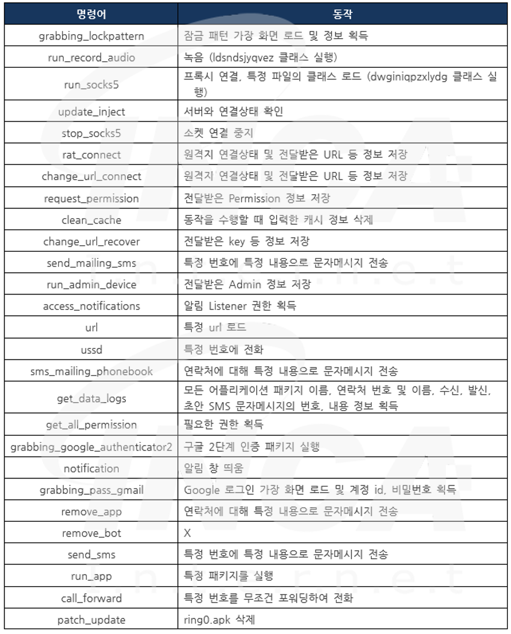 그리고 원격지로부터 'run_cmd' 명령을 받으면, 함께 전송 받은 정보를 통해 아래의 표와 같이 추가적인 악성동작을 수행할 수 있다.