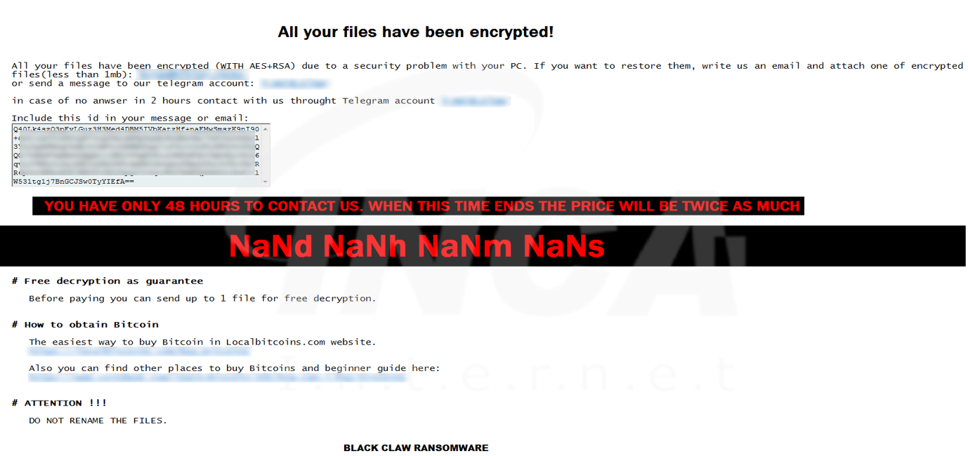 파일명에 ".bclaw" 확장자를 추가하고 [그림 5]의 랜섬노트를 생성하는 "BlackClaw" 랜섬웨어가 발견됐다.