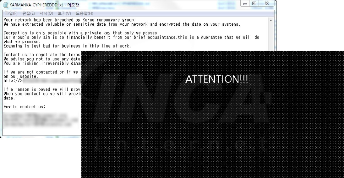 파일명에 ".KARMANKA" 확장자를 추가하고 "KARMANKA-CYPHEREDDD.txt"라는 랜섬노트를 생성하는 "Karma" 랜섬웨어의 변종이 발견됐다. 해당 랜섬웨어는 [그림 1]과 같이 바탕화면 배경을 변경한다.