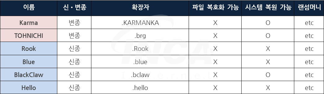 잉카인터넷 대응팀은 2021년 11월 26일부터 2021년 12월 02일까지 랜섬웨어 신•변종 및 이슈와 관련하여 대응을 진행하였으며, 신종 랜섬웨어는 "Rook"외 3건, 변종 랜섬웨어는 "Karma"외 1건이 발견됐다.