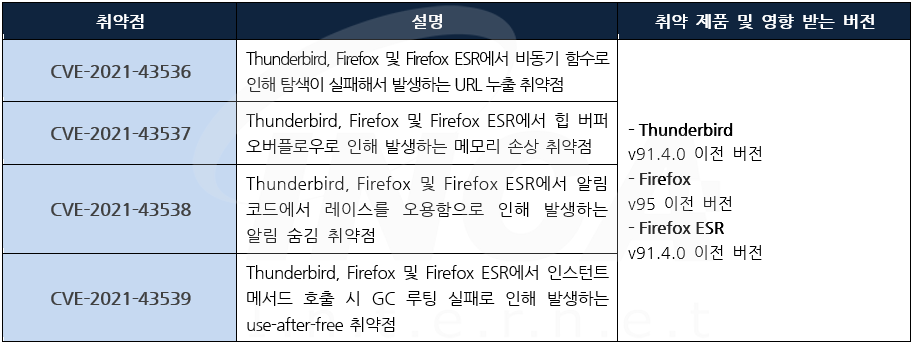 Mozilla 사는 제품에서 발생하는 취약점에 대한 보안 업데이트를 발표하고, 관련 취약점을 해결하기 위해 최신 버전으로 업데이트할 것을 권고하였다.