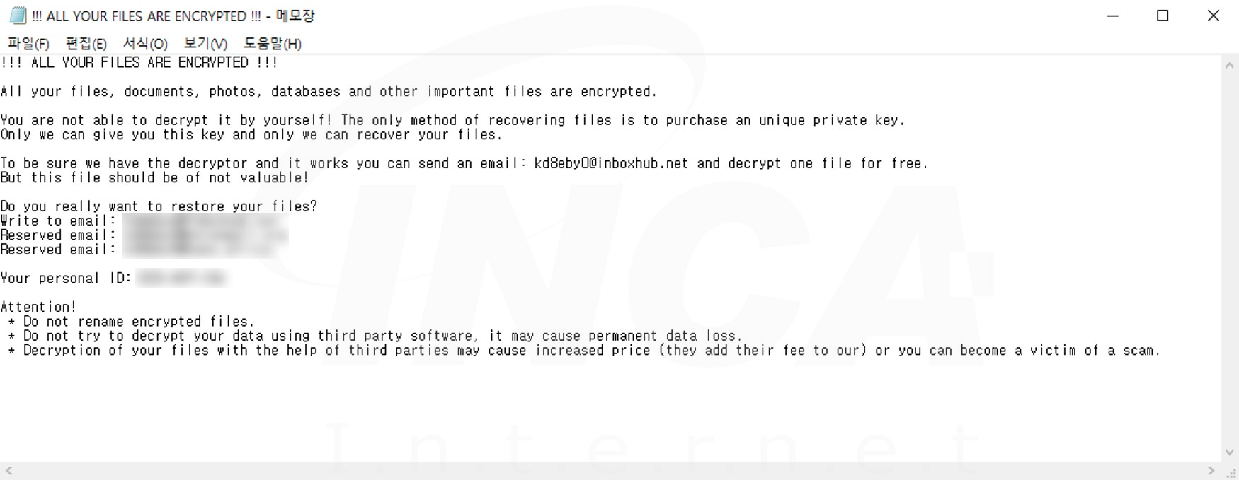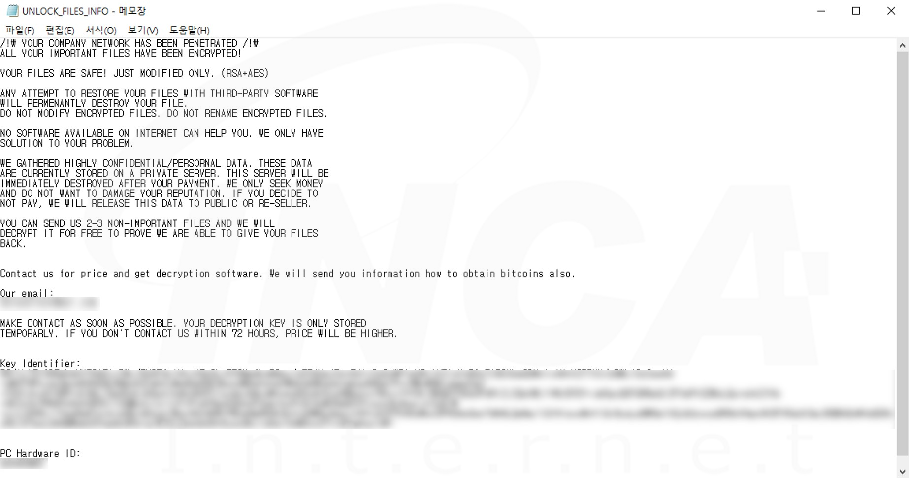 확장자를 변경하지 않고 [그림 7]의 랜섬노트를 실행하는 "Arcane" 랜섬웨어가 발견됐다.