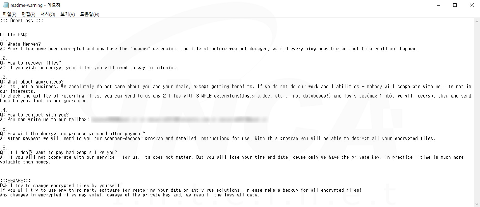 파일명에 ".[키 값].[공격자 메일].bas" 확장자를 추가하고 "readme-warning.txt"라는 랜섬노트를 생성하는 "Beseus" 랜섬웨어가 발견됐다. 해당 랜섬웨어는 시스템의 복원을 무력화한다.
