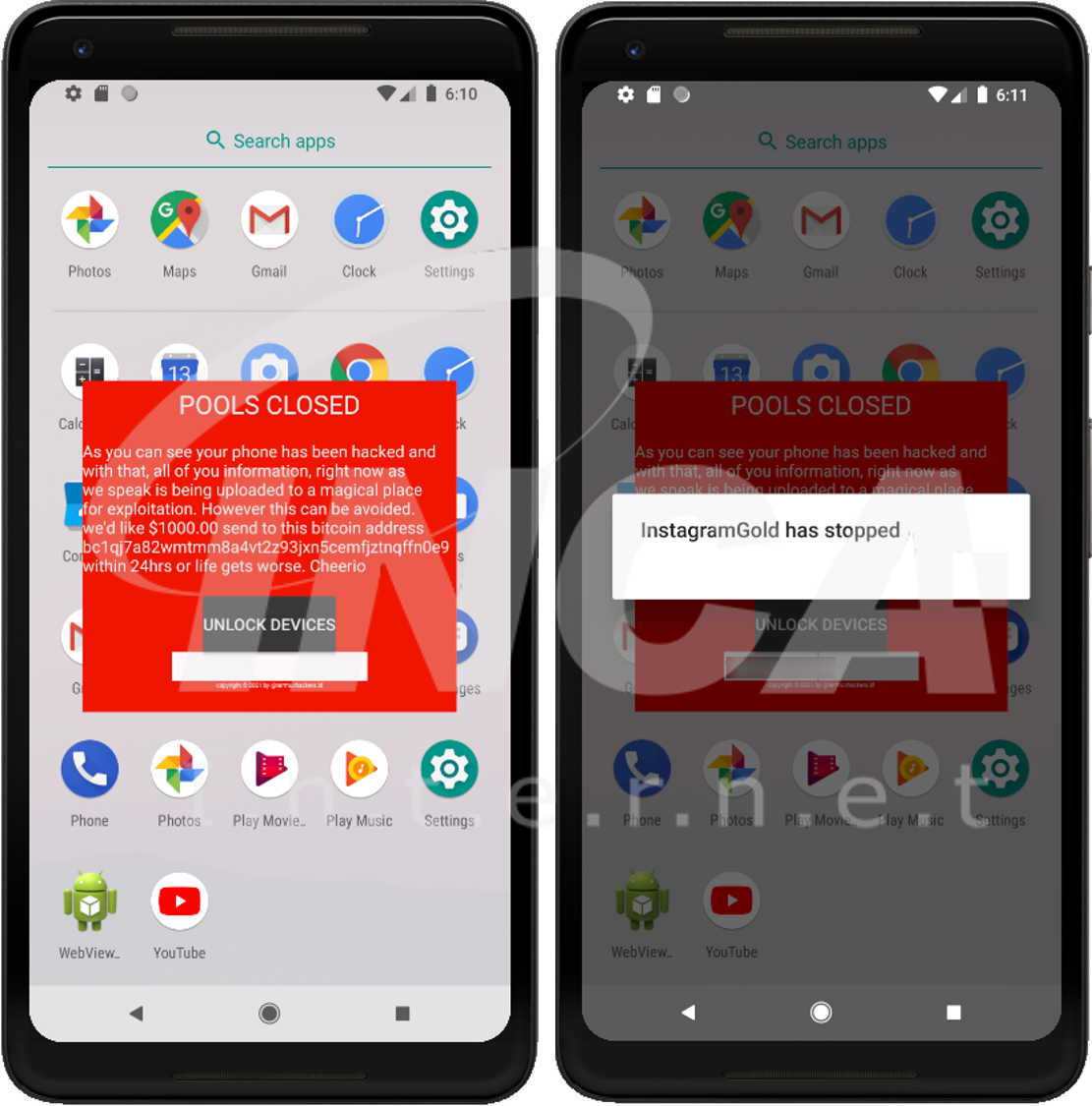 그 외의 악성 동작은 없으나, 암호를 입력하기 전까지 재부팅하거나 화면을 껐다가 켜도 암호 창은 사라지지 않아 사용에 불편을 겪게 된다.