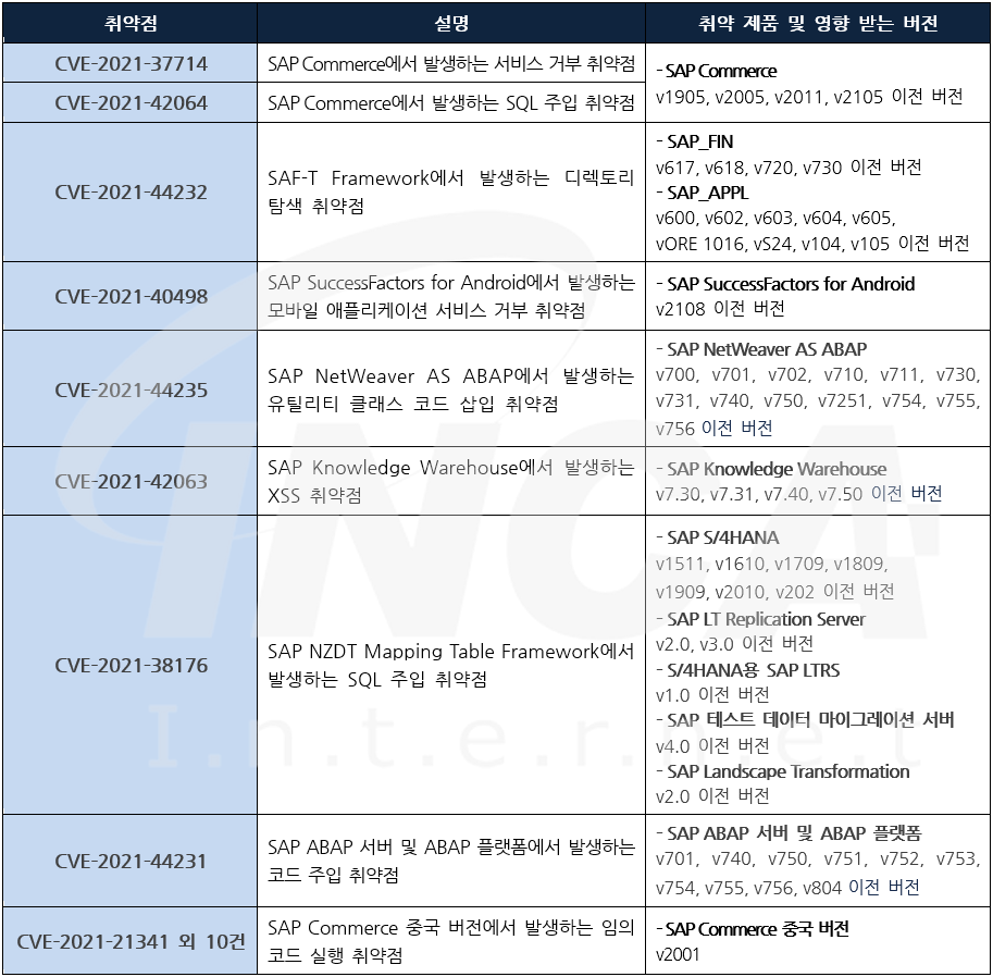 SAP 소프트웨어 사는 제품에서 발생하는 취약점에 대한 보안 업데이트를 발표하고, 관련 취약점을 해결하기 위해 최신 버전으로 업데이트할 것을 권고하였다.