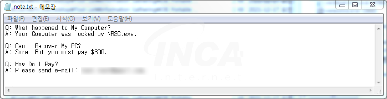 파일명에 ".NRCL" 확장자를 추가하고 "note.txt"라는 랜섬노트를 생성하는 "NRCL" 랜섬웨어가 발견됐다.
