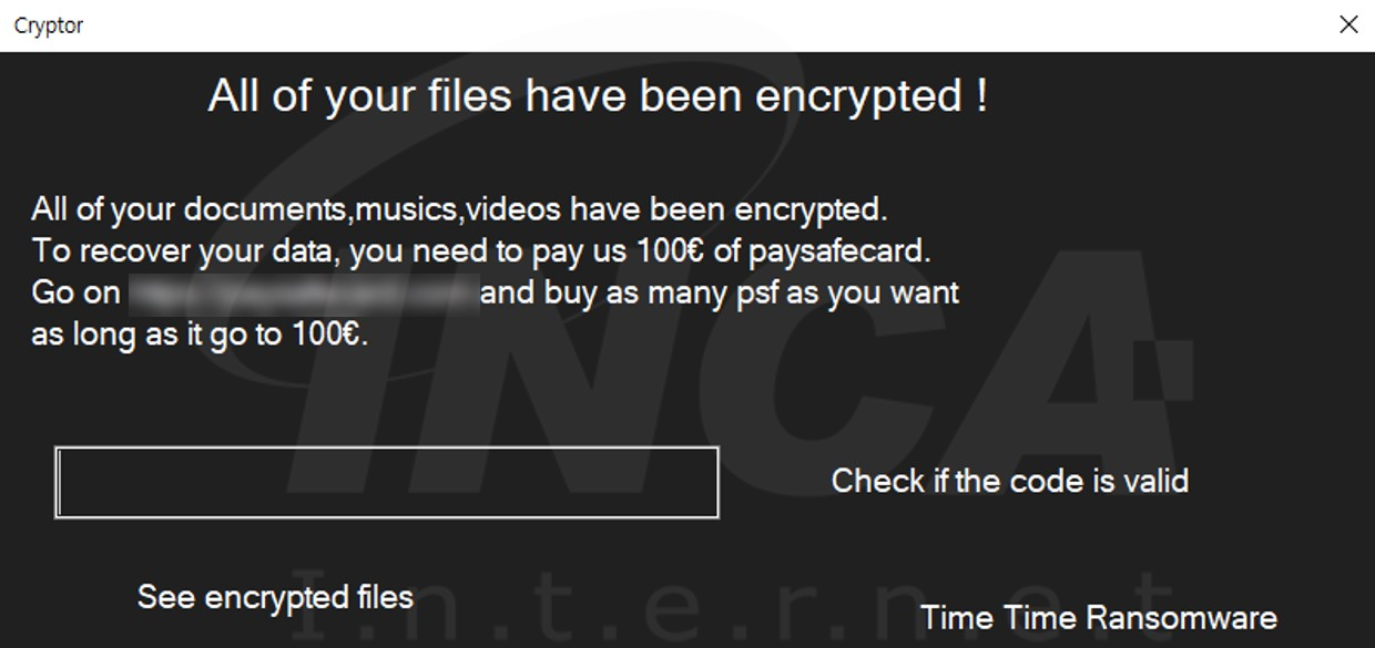 파일명에 ".timetime" 확장자를 추가하고 [그림 7]의 랜섬노트를 실행하는 "TimeTime" 랜섬웨어가 발견됐다. 해당 랜섬웨어는 시스템 복원을 무력화한다.