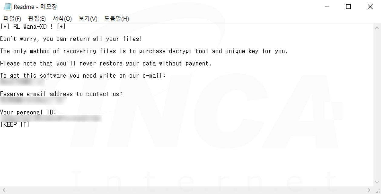 파일명에 ".XD-99" 확장자를 추가하고 "Readme.txt"라는 랜섬노트를 생성하는 "WannaXD" 랜섬웨어가 발견됐다. 해당 랜섬웨어는 공격자의 C&C 서버에 연결을 시도한다.