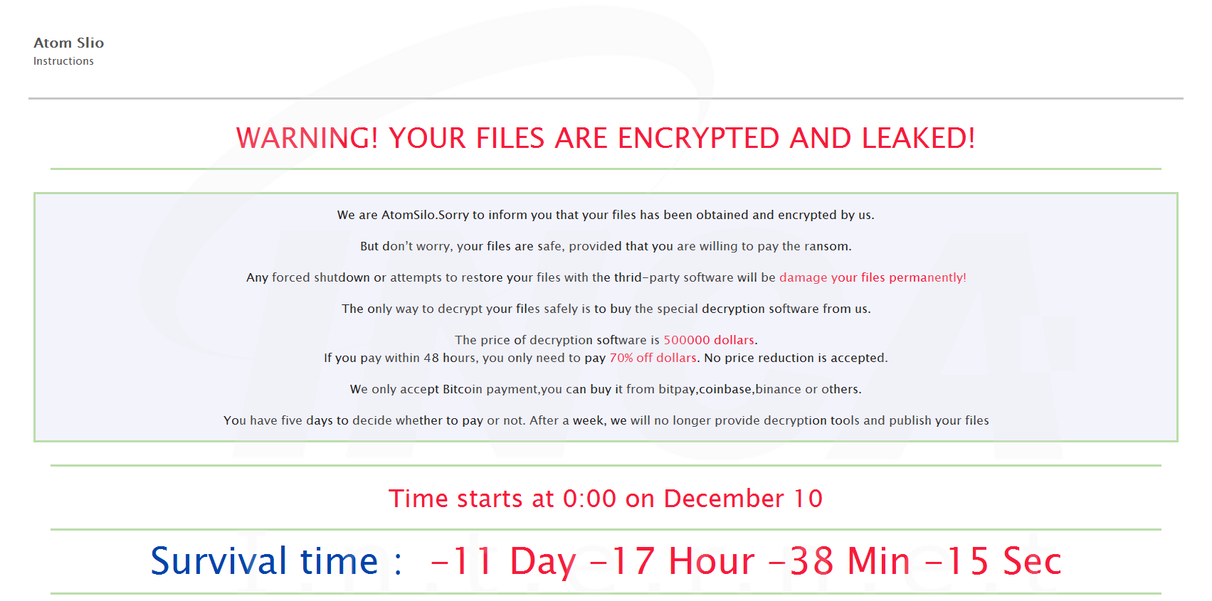파일명에 ".ATOMSILO" 확장자를 추가하고 "README-FILE-[PC 이름]-[키 값].hta"라는 랜섬노트를 생성하는 "AtomSilo" 랜섬웨어의 변종이 발견됐다. 해당 랜섬웨어는 공격자의 C&C 서버에 연결을 시도한다.