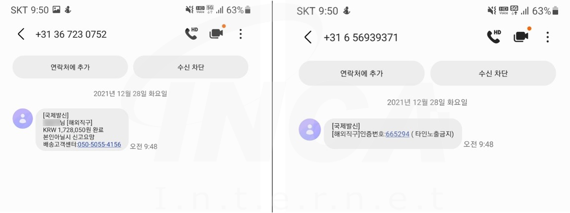 문자에는 해외 결제 문자나 결제 시 사용되는 인증 번호 문자로 위장하여 전송되며 문자를 수신한 사용자가 결제 사실이 없어 해당 번호로 전화할 경우 개인정보 등이 탈취될 수 있기에 주의가 필요하다.