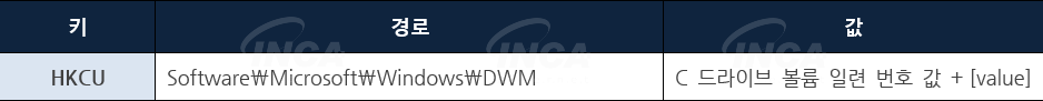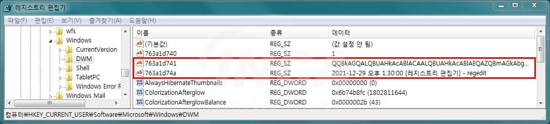 이후, 레지스트리에서 데스크탑 창 관리를 목적으로 사용하는 DWM 키에 악성코드에서 사용할 값을 등록한다.