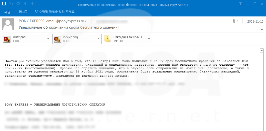 공격자는 악성코드 유포를 위해 러시아 운송업체인 Pony Express에서 발송한 것처럼 위장한 이메일에 악성파일을 첨부하는 방식을 사용했다.