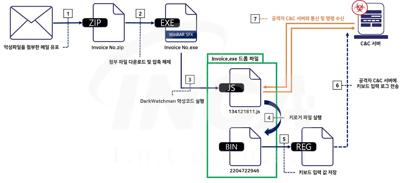 "DarkWatchman" 악성코드의 유포 및 실행 과정은 [그림 1]과 같이 진행한다.