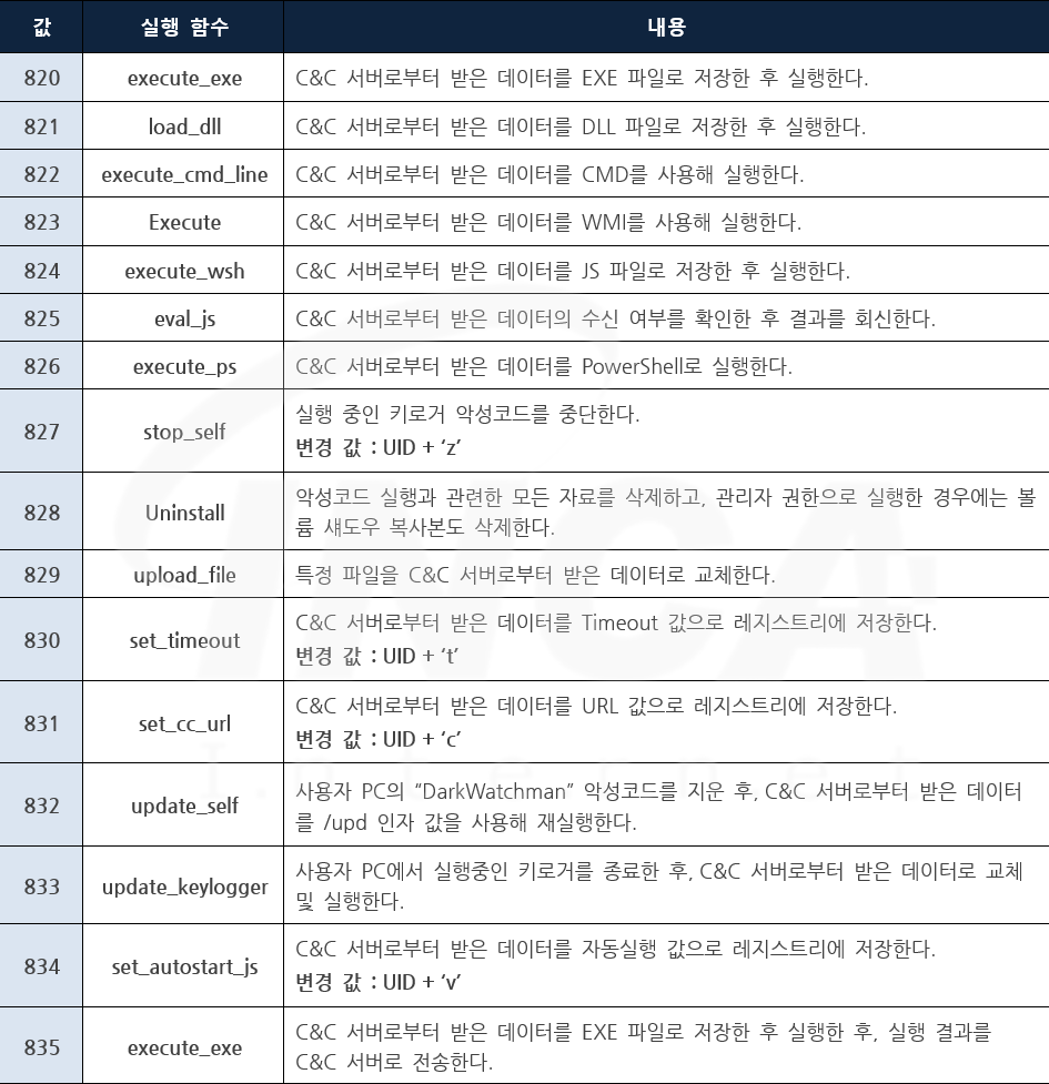 공격자가 운영하는 C&C 서버와 정상적으로 연결해 받아온 명령의 정보는 [표 5]와 같으며, 실행 함수는 실제 코드에서 실행하는 함수 명이다.