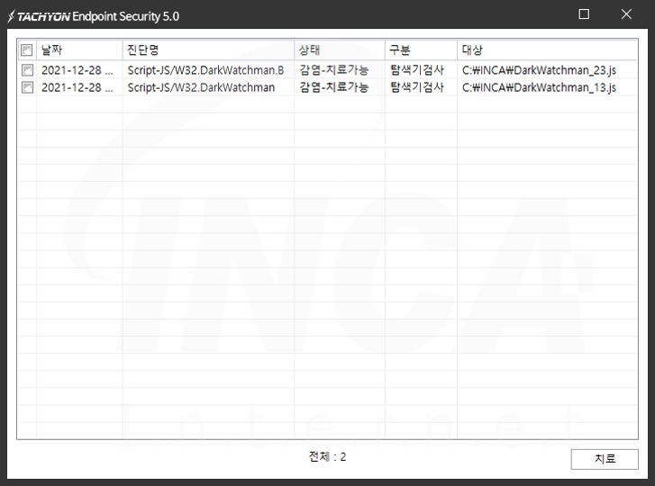 상기 악성코드는 잉카인터넷 안티바이러스 제품 TACHYON Internet Security 5.0에서 진단 및 치료가 가능하다.