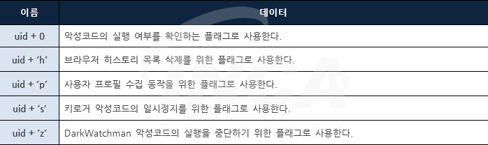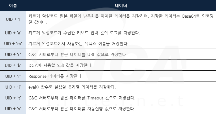 [표 4]의 값들은 공격자가 운영하는 C&C 서버로부터 받은 데이터 등을 저장하거나 키로거 악성코드와 관련한 값을 저장한다.