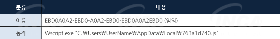악성코드가 [표 2]의 경로에 등록하는 값은 플래그 또는 데이터 저장을 위한 목적으로 나뉜다. [표 3]은 두 가지 목적 중 플래그로 사용하는 값을 정리한 표이다. 초기에 플래그로 사용하는 값은 설정돼 있지 않으며, 공격자가 지정한 명령을 받거나 악성 행위를 수행한 후에 1로 설정한다.