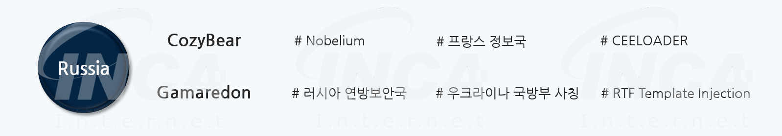 러시아의 해커그룹들은 정부기관의 지원을 받아 활동하여, 오랜 시간 동안 지속적으로 모습을 드러내었다. 그 중 CozyBear 의 경우, 러시아 SVR 을 배후로 두고 있으며, 미국과 프랑스를 비롯하여 여러 국가를 대상으로 공격을 수행하였다. 이로 인해 프랑스 정보국에서는 해당 해커그룹 관련 자료를 발표하는 등의 조치를 취하고 있다. 그 외에도 피싱 메일을 유포하여 공격을 수행하는 Gamaredon 해커그룹은 최근 새롭게 RTF Template Injection 기술을 활용하여 공격을 수행하였다.