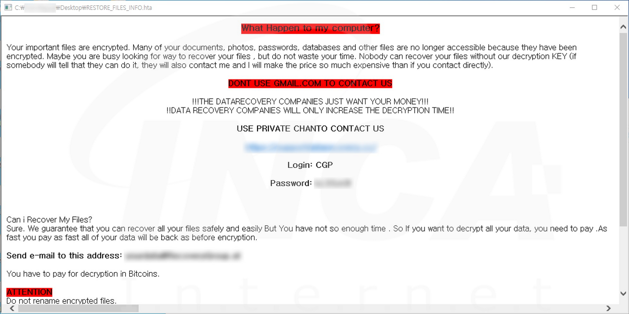 파일명에 ".cgp" 확장자를 추가하고 "RESTORE_FILES_INFO.txt"라는 랜섬노트를 생성하는 "CGP" 랜섬웨어가 발견됐다. 해당 랜섬웨어는 사용자의 정보를 탈취하고 공격자의 C&C 서버와 연결을 시도한다.