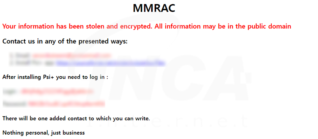 파일명에 ".MRAC" 확장자를 추가하고 "MRACReadMe.html"라는 랜섬노트를 생성하는 "MRAC" 랜섬웨어가 발견됐다. 해당 랜섬웨어는 시스템 복원을 무력화하고 특정 프로세스의 실행 차단 및 특정 서비스를 종료한다.