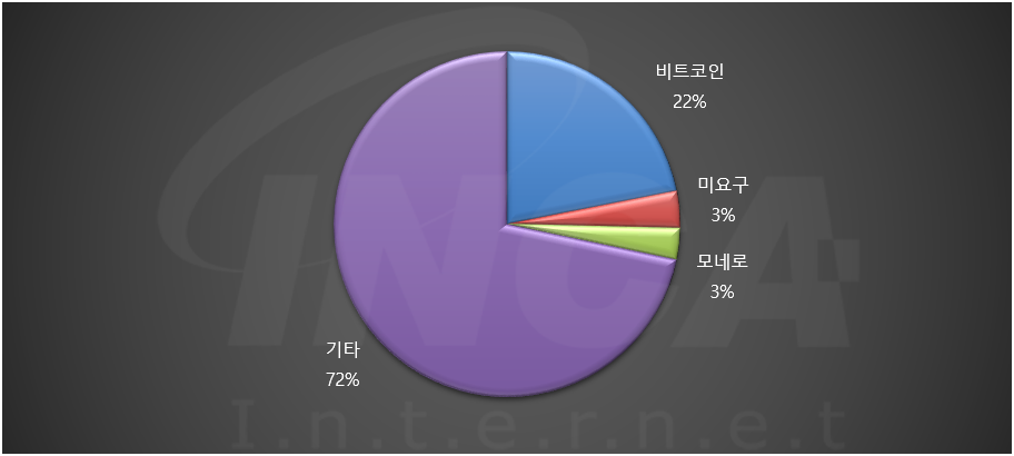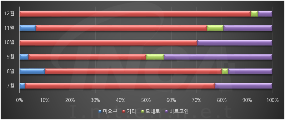 2021년 하반기(7월 1일 ~ 12월 31일) 동안 월별로 랜섬웨어가 요구한 랜섬머니를 조사했을 때 주로 비트코인(BTC) 요구가 많았고, 모네로(XMR)나 랜섬머니를 요구하지 않는 경우는 매월 낮은 비율을 차지했다.