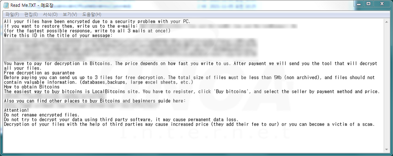 파일명에 ".HACKED" 확장자를 추가하고 [그림 5]의 랜섬노트를 생성하는 "JenusLocker" 랜섬웨어가 발견됐다.