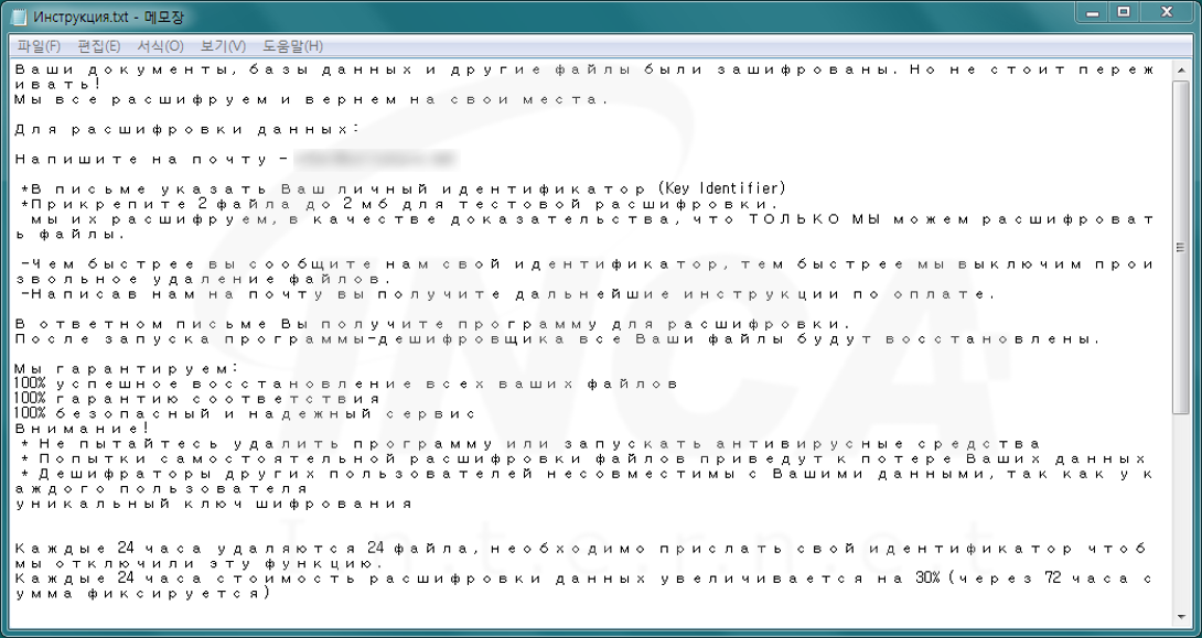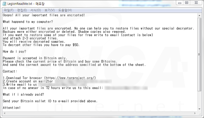 파일명에 ".[52자리 문자열]" 확장자를 추가하고 "LegionReadMe.txt"라는 랜섬노트를 생성하는 "LegionLocker" 랜섬웨어의 변종이 발견됐다. 해당 랜섬웨어는 작업 관리자를 무력화한다.