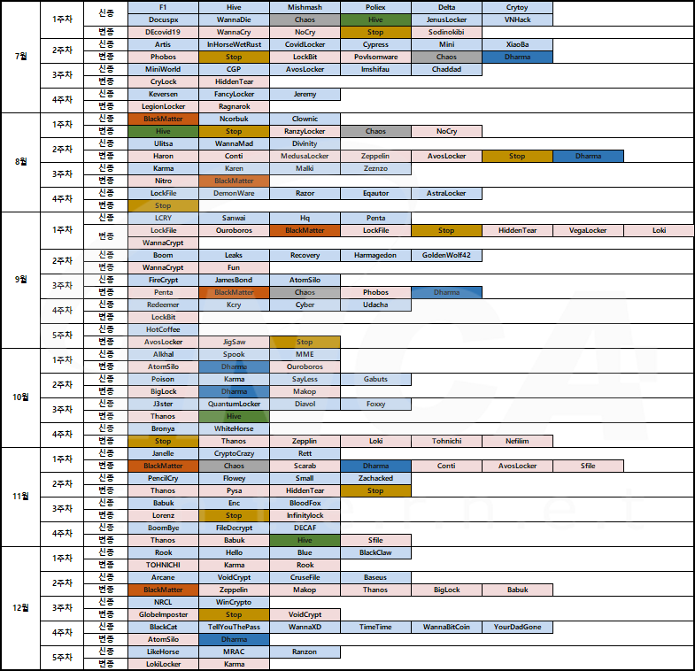 2021년 하반기(7월 1일 ~ 12월 31일) 동안의 신•변종 랜섬웨어는 아래 표와 같고, 신종은 푸른색, 변종은 붉은색으로 표시했다. 이외에 표시된 색상은 하반기 내 신•변종이 5건 이상인 랜섬웨어이다.