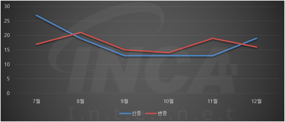 2021년 하반기(7월 1일 ~ 12월 31일) 동안 잉카인터넷 대응팀은 랜섬웨어 신•변종 현황을 조사하였으며, 하반기에 발견된 신•변종 랜섬웨어의 건수는 [그림 1]과 같다. 하반기에는 월 평균 34건의 랜섬웨어가 발견됐으며 이 중, 신종과 변종 랜섬웨어는 각각 7월과 8월에 가장 많이 발견됐다.
