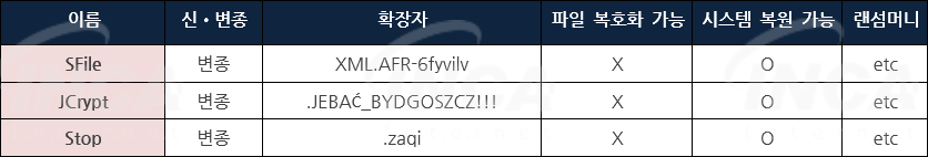 잉카인터넷 대응팀은 2022년 1월 7일부터 2022년 1월 13일까지 랜섬웨어 신•변종 및 이슈와 관련하여 대응을 진행하였으며, 변종 랜섬웨어는 "SFile"외 2건이 발견됐다.
