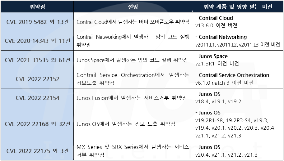 Juniper 사는 제품에서 발생하는 취약점에 대한 보안 업데이트를 발표하고, 관련 취약점을 해결하기 위해 최신 버전으로 업데이트할 것을 권고하였다.