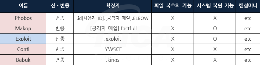 잉카인터넷 대응팀은 2022년 1월 21일부터 2022년 1월 27일까지 랜섬웨어 신•변종 및 이슈와 관련하여 대응을 진행하였으며, 신종 랜섬웨어는 "Exploit" 1건, 변종 랜섬웨어는 "Phobos"외 3건이 발견됐다.