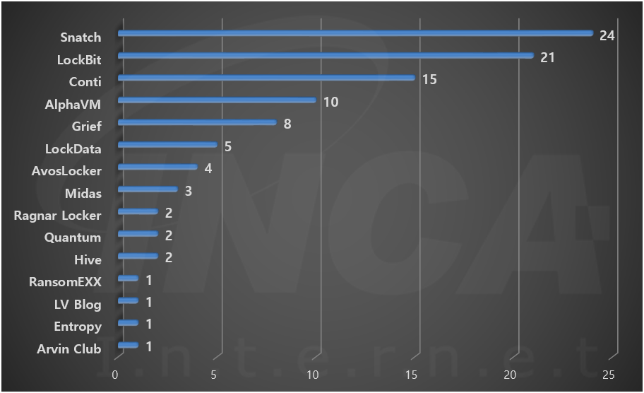 2022년 1월(1월 1일 ~ 1월 31일)에 발생한 데이터 유출 현황을 랜섬웨어 진단명 별로 비교하였을 때 "Snatch" 랜섬웨어가 24건으로 가장 많은 데이터 유출이 있었고, "LockBit" 랜섬웨어가 21건으로 두번째로 많이 발생했다.
