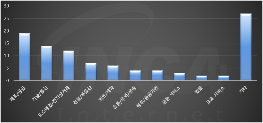 2022년 1월(1월 1일 ~ 1월 31일)에 발생한 데이터 유출 건을 산업별로 비교하였을 때 제조/공급 분야가 가장 많은 공격을 받았고, 기술/통신 분야가 그 뒤를 따랐다.