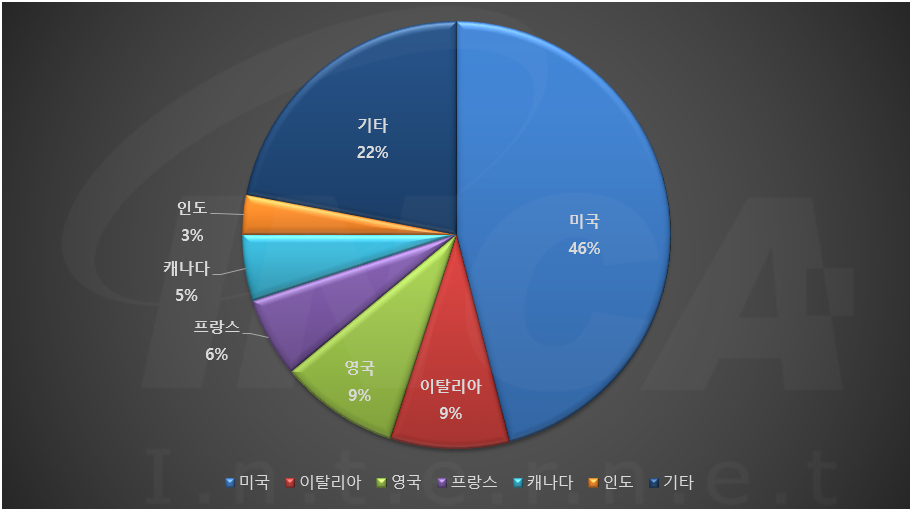 2022년 1월(1월 1일 ~ 1월 31일)에 발생한 데이터 유출 건을 국가별로 비교하였을 때 미국이 46%로 가장 높은 비중을 차지했고, 영국과 이탈리아가 각각 9%, 프랑스가 6%로 그 뒤를 따랐다.
