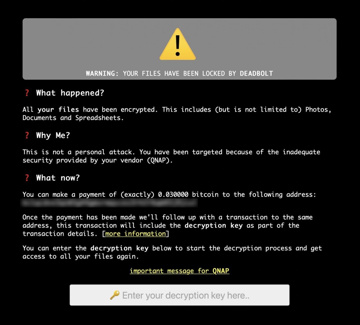 외신에 따르면 해당 랜섬웨어는 QNAP NAS 장치의 파일을 암호화하고, 파일명에 ".deadbolt"라는 확장자를 추가한다고 알려졌다. 또한 공격자가 QNAP의 로그인 페이지를 하이재킹해 "WARNING: Your files have been locked by DeadBolt"라는 랜섬노트를 생성한다고 언급했다.