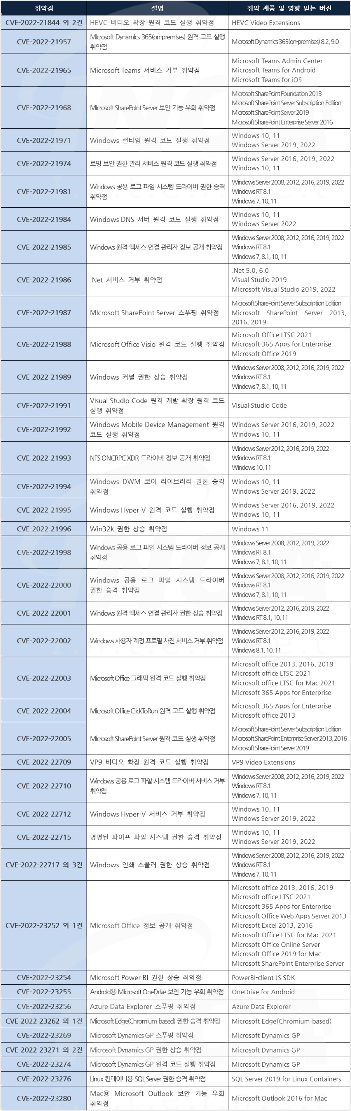 Microsoft 사는 제품에서 발생하는 취약점에 대한 보안 업데이트를 발표하고, 관련 취약점을 해결하기 위해 최신 버전으로 업데이트할 것을 권고하였다.