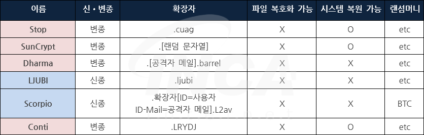잉카인터넷 대응팀은 2022년 2월 4일부터 2022년 2월 10일까지 랜섬웨어 신•변종 및 이슈와 관련하여 대응을 진행하였으며, 신종 랜섬웨어는 "Scorpio" 외 1건, 변종 랜섬웨어는 "Stop" 외 3건이 발견됐다.