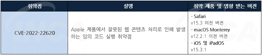 Apple 사는 제품에서 발생하는 취약점에 대한 추가 보안 업데이트를 발표하고, 관련 취약점을 해결하기 위해 최신 버전으로 업데이트할 것을 권고하였다.