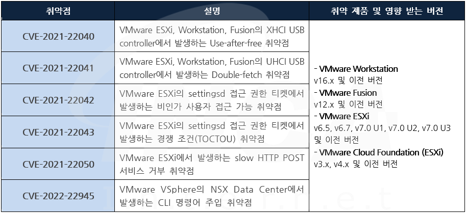 VMware 사는 제품에서 발생하는 취약점에 대한 보안 업데이트를 발표하고, 관련 취약점을 해결하기 위해 최신 버전으로 업데이트할 것을 권고하였다.