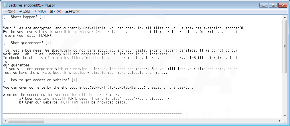 파일명에 ".encoded01" 확장자를 추가하고 “BackFiles-encoded01.txt"라는 랜섬노트를 생성하는 "Sugar" 랜섬웨어의 변종이 발견됐다. 해당 랜섬웨어는 공격자의 C&C 서버에 연결을 시도한다.