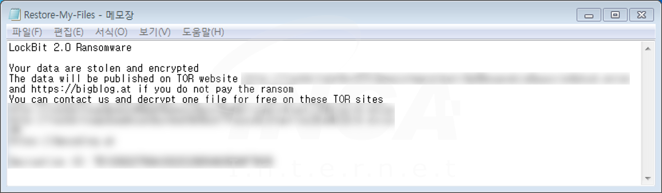 파일명에 ".lockbit" 확장자를 추가하고 “Restore-My-Files.txt"라는 랜섬노트를 생성하는 "LockBit" 랜섬웨어의 변종이 발견됐다. 해당 랜섬웨어는 시스템 복원을 무력화한다.